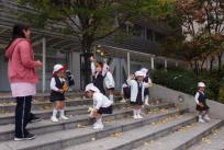 きれいに色づいた落ち葉が秋風に舞っています。年少のお友だちは、学園内を散歩に出かけ、葉っぱを拾ったり、舞っている葉っぱを追いかけたり、葉っぱを飛ばしたりして遊んでいます。 「見てー! こんな大きい葉っぱ」 「赤と黄色が混ざってるよ。」 「葉っぱ落ちてきたー!」 「葉っぱの雨だよ。」 と、楽しそうですよ。