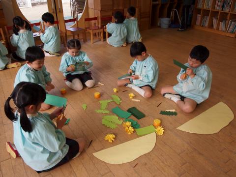 生活発表会のお芝居のお稽古もしていますが、それと同時に道具作りも頑張ってきた子ども達です。ペンギンのお話では南極の氷をお友だちと協力して作ったり、こっこさんのお家のお庭のお花を作ったり、みつばちマーヤのお話では、お池の睡蓮の葉っぱを作ったり、いい道具が出来ました。今は、それを使ってお芝居のお稽古を楽しんでいます。