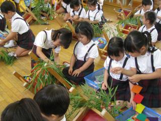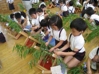 皆で七夕のお話のペープサートを楽しんだ後、今まで自分で作ってきた笹飾りを一人一本ずつの笹の枝に結び付けました。