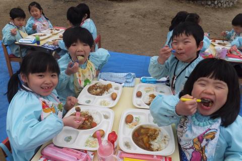 外で食べた年長、年中さんは、プチピクニック気分でなんだかいい気持ち!いちだんと給食がおいしかったようです。「おいしい!」「おかわりしよ~!」と、みんないつもより食べるのが早く、おかわりする子ども達も多かったです。とても楽しい思い出ができましたね。