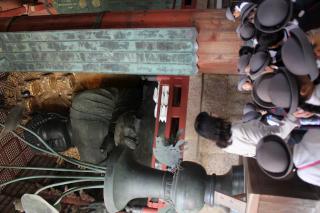 年長組はバスで奈良東大寺の大仏様を見に行きました。正倉院展で賑わう奈良公園を通り、南大門をくぐると、前には大仏殿の姿が現れます。遠足などで何度か訪れたことのある場所ですが、この日の年長組さんの様子はそれまでとは少し違っていました。本当に熱心に大仏様のお姿を眺めたり目を凝らして表情や周りの様子を見ているのも印象的でした。『優しい目をしてる』『少し笑っているみたい』『周りにもたくさん仏様がいるね』『すごいお耳、ぼくらの声も聞こえてるかな』…いろんな感想が聞こえてきます。自分で感じたままの大仏様を、翌日墨と絵の具を使って表現しました。