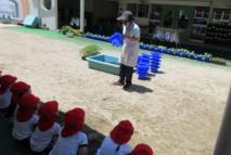 今年度初めての年長組の体操。河戸先生が 「元気なお友だち!」 と言うと、「はい!」 と手をあげて、みんな大きな声で答えて...